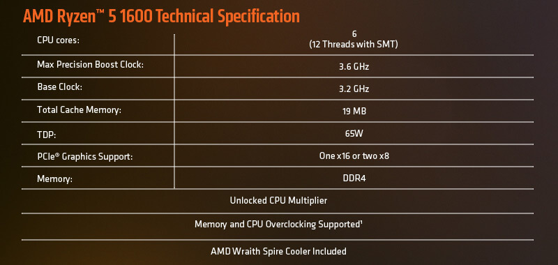 AMD RYZEN 5 1600 3.2 GHz Socket AM4 Processor with Wraith Spire 65W cooler